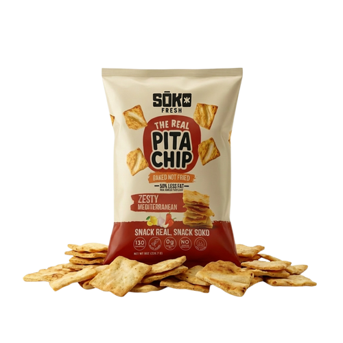 Our zesty Mediterranean Pita Chips are baked from real pita bread and seasoned with bold, vibrant spices inspired by Mediterranean flavors. Tangy, savory, and anything but boring.